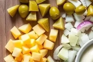 - Картофель и морковь нарезаем маленькими пластиками, лук — квадратиками.