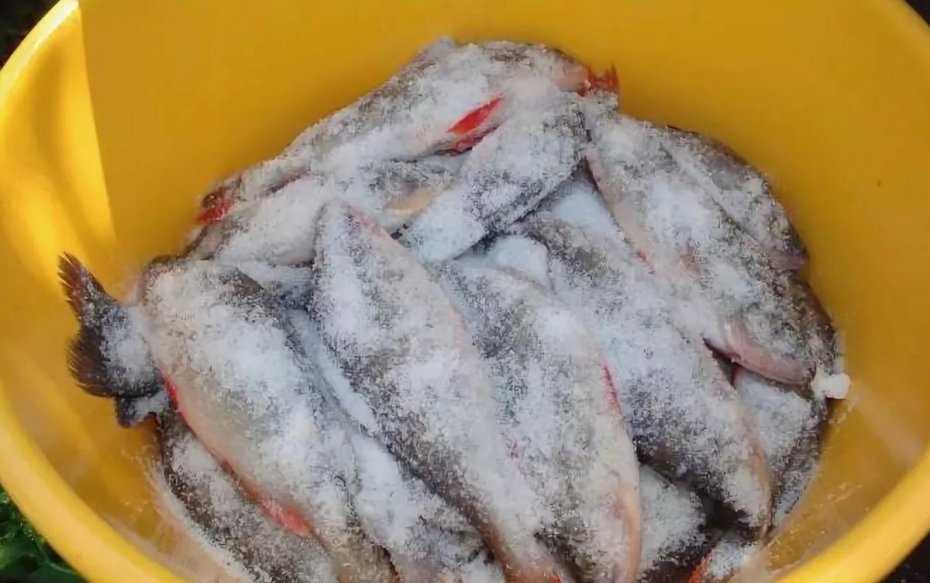 Прежде чем солить рыбу перед сушкой, стоит выбирать соль с очень крупными частичками. Соль «Экстра» или йодированная для этой цели не подходят. На поверхности рыбы образовывается соляная корочка, которая препятствует попаданию рассола внутрь. Если для сушения используется замороженная рыба, то, прежде всего, стоит дождаться полной разморозки. Это должно происходить при комнатной температуре.