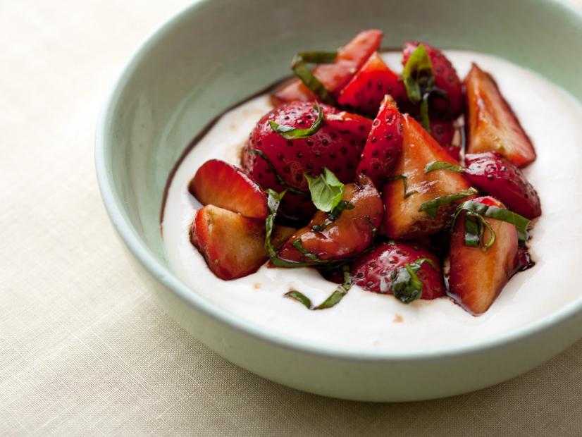- В средней миске смешайте ягоды клубники с базиликом и остывшим бальзамическим сиропом.
