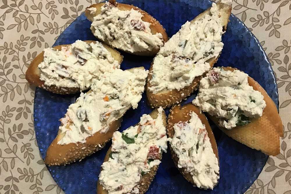Брускетта с вялеными помидорами, оливками и рикоттой