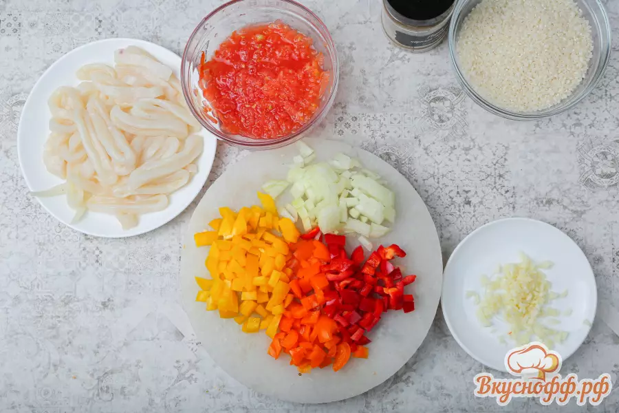 Шаг 6 Подготовьте оставшиеся ингредиенты. Лук очистите и нарежьте кубиками. У сладкого перца удалите плодоножку и семена. Нарежьте кубиками. Оставшийся чеснок очистите и мелко порубите ножом. Помидоры измельчите при помощи блендера или мясорубки. Очищенные тушки кальмаров нарежьте кольцами.