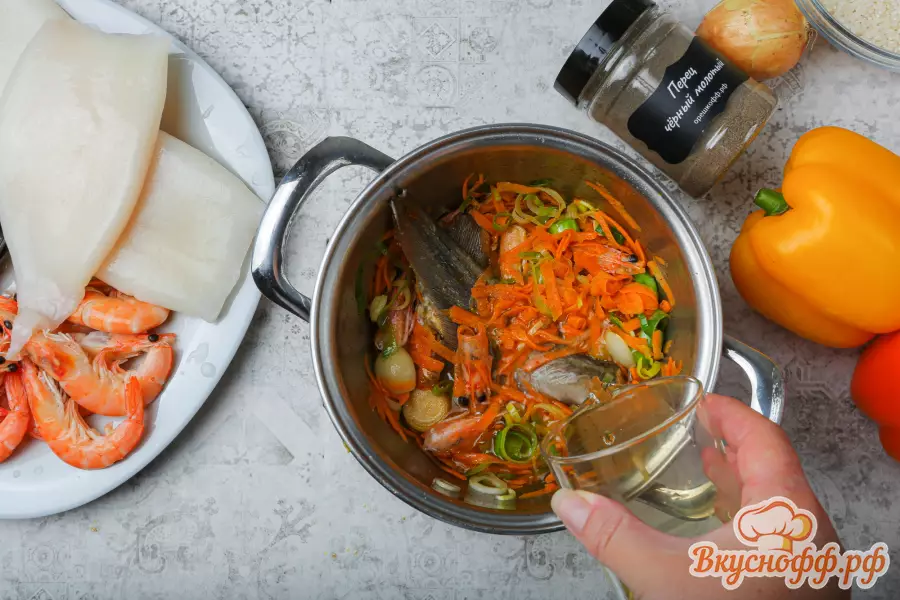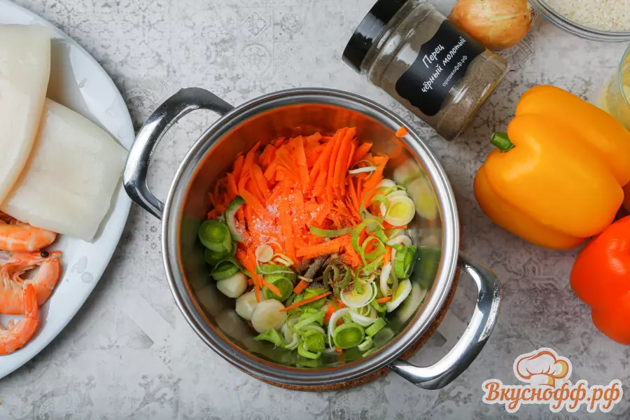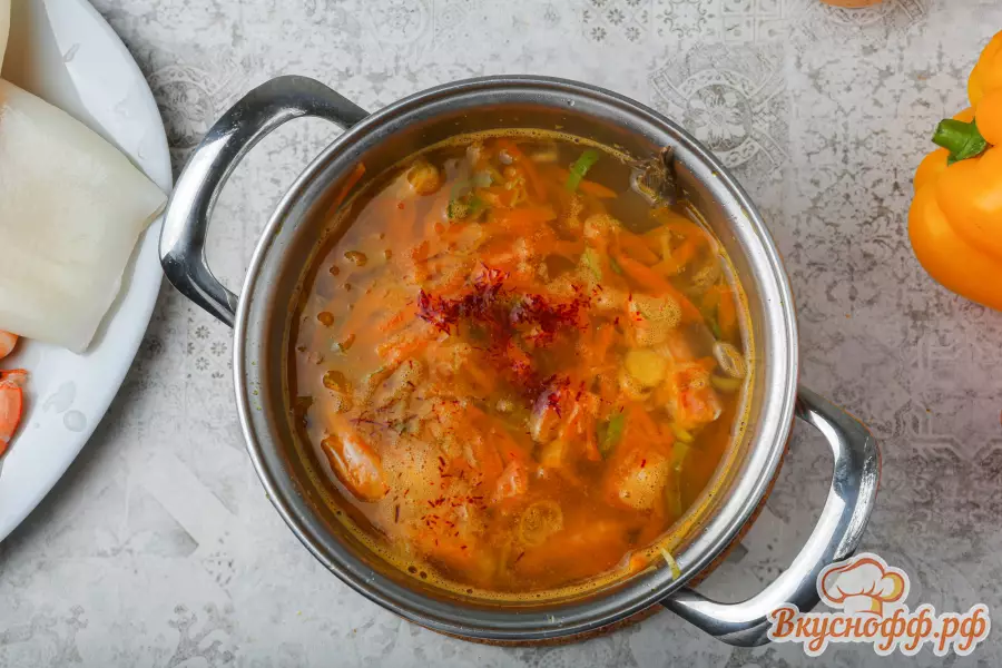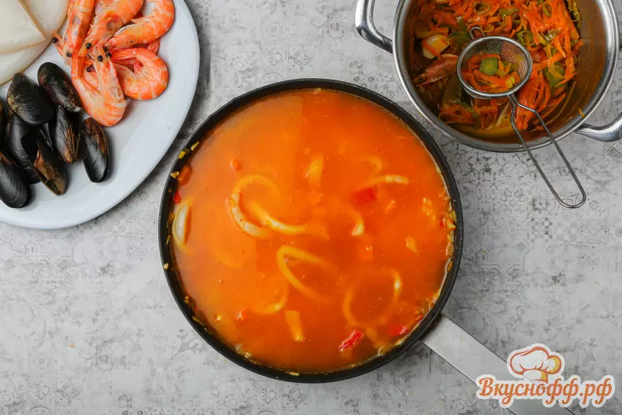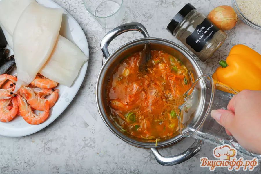 Шаг 9 В кастрюлю с рисом, овощами и кальмарами влейте бульон. Варите 10 минут на медленном огне. Затем сверху выложите креветки, мидии (мы использовали мидии в створках) и варите ещё 3-5 минут. Кастрюлю снимите с плиты, накройте крышкой и дайте настояться 15 минут.