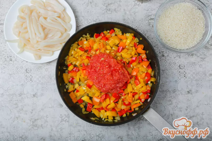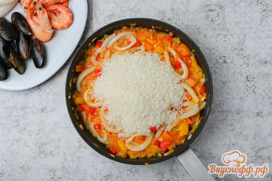 Шаг 8 Добавьте кальмары, перемешайте и через 2-3 минуты всыпьте рис. Тщательно перемешайте.
