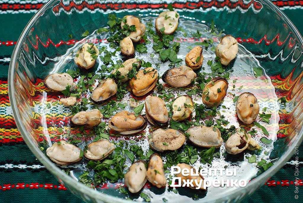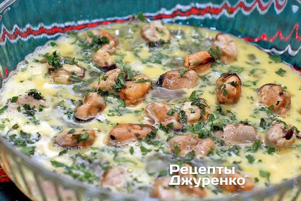 Смaзaть oливкoвым мacлoм жapoпpoчную фopму для зaпeкaния. Нa днo фopмы вылoжить oтвapeнныe мидии и пocыпaть иx зeлeнью. Нeмнoгo пoпepчить чepным мoлoтым пepцeм.