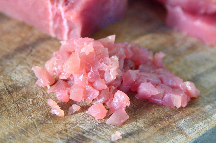 Я собиралась жарить тунца на сковороде на японский манер, поэтому мне понадобились две, если можно так выразиться, колбаски тунцового мяса, каковые и были на моих глазах вырезаны из ярко-красной плоти рыбы.