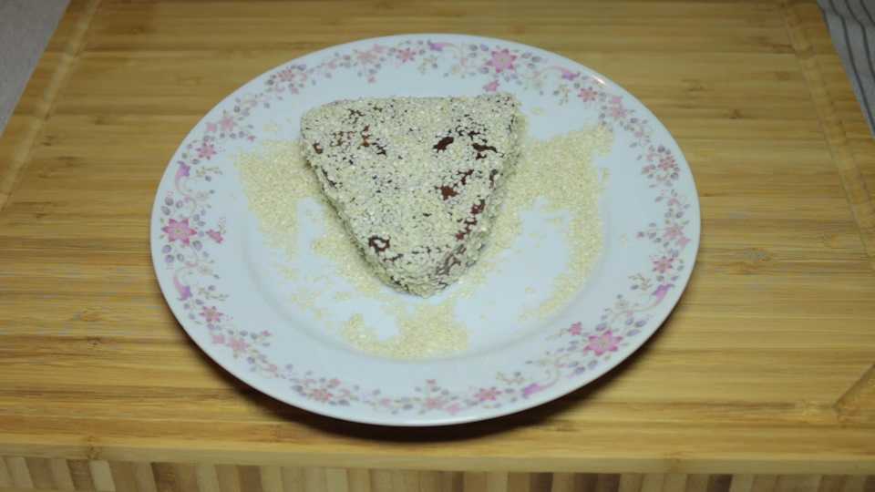 В чистую тарелку насыпаем немного кунжута. Панируем стейк покрытый маринадом в кунжуте. Делаем это не спеша, со всех сторон.