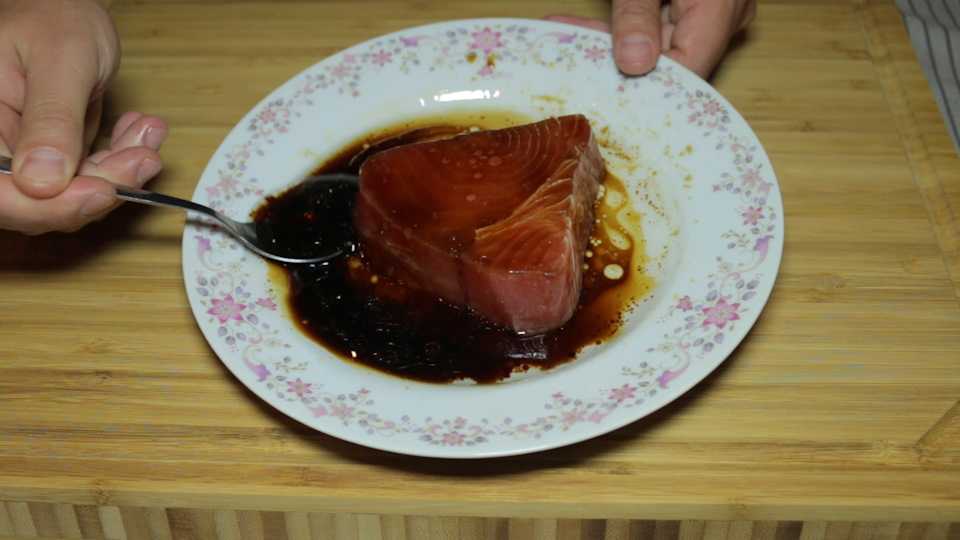 Опускаем стейк из тунца в маринад. Делаем так, чтобы маринад покрывал всю поверхность стейка. Даем стейку промариноваться 1 минуту. После этого обливаем стейк маринадом при помощи чайной ложки и оставляем ещё на 1 минуту. Рыба охотно впитывает соевый соус и меняет свой цвет на глазах, поэтому мариновать её 2 минуты -вполне достаточно.