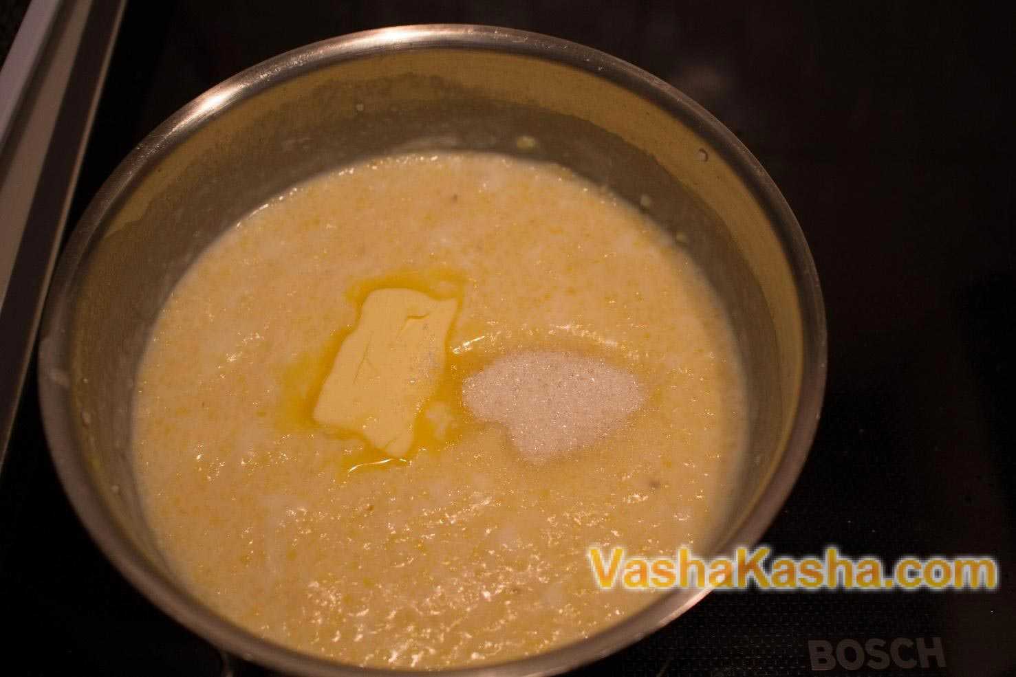 Периодически перемешиваем, ведь кукурузная крупа имеет склонность оседать на дно и пригорать.