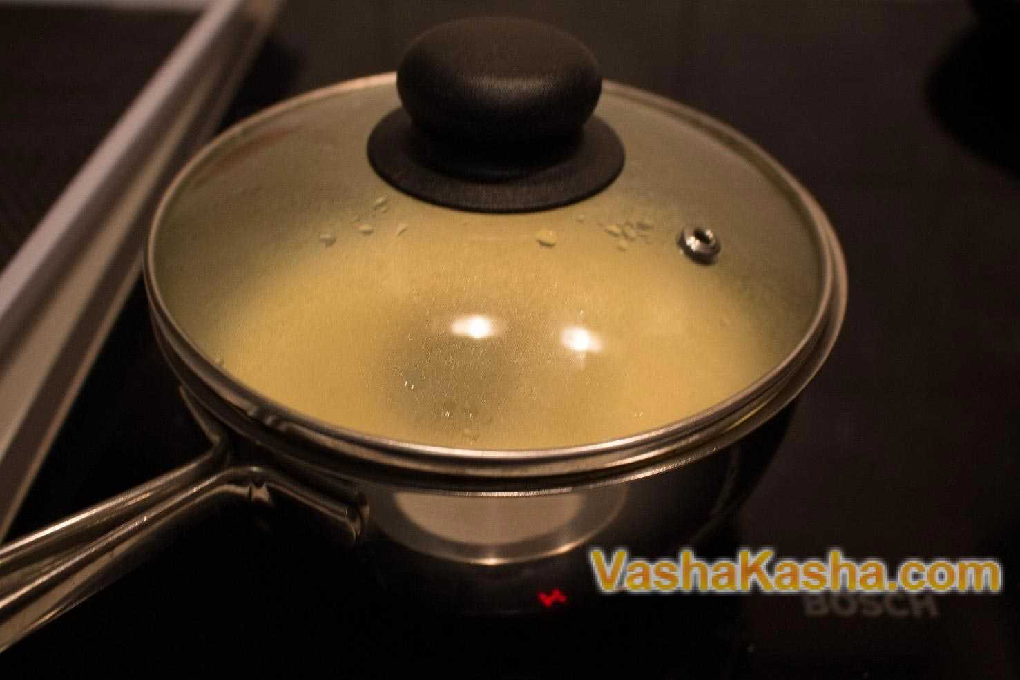 Вливаем 2 стакана воды комнатной температуры, даем закипеть и убавляем огонь до минимума. Варим, пока не выпарится вода.