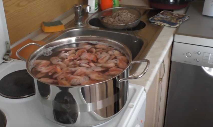 2. Вскипятите в кастрюле 2 л подсоленной воды, выложите в нее промытые креветки, снова доведите до кипения. Дайте покипеть 1,5-2 минуты и откиньте креветки на дуршлаг. После остывания очистите.