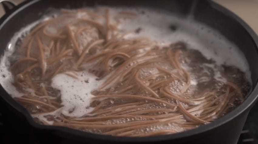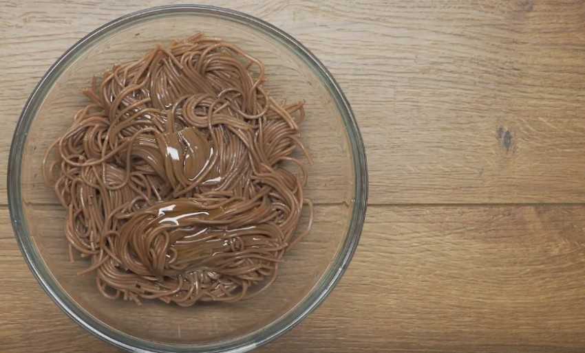 5. В кастрюле вскипятите воду, подсолите. Выложите гречневую лапшу и варите в соответствии с инструкцией на упаковке около 4 минут. Откиньте на дуршлаг и промойте холодной водой. Влейте кунжутное или оливковое масло и хорошо перемешайте.