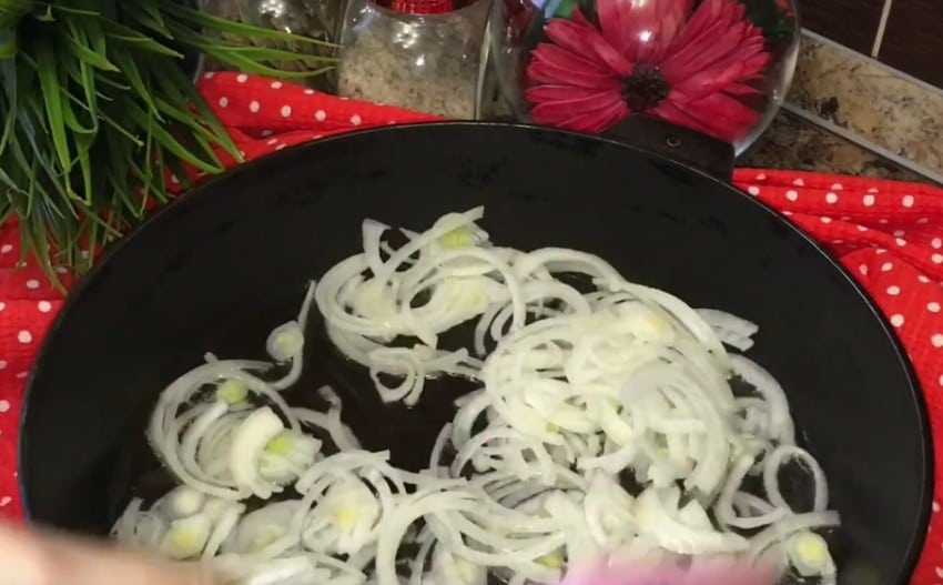 Приготовить такую заправку очень просто: вам нужно лишь растопить на сковородке или в специальном ковшике кусочек сливочного маслица. После обжарьте репчатый лук и зубчик чеснока в той же посуде до прозрачного состояния.