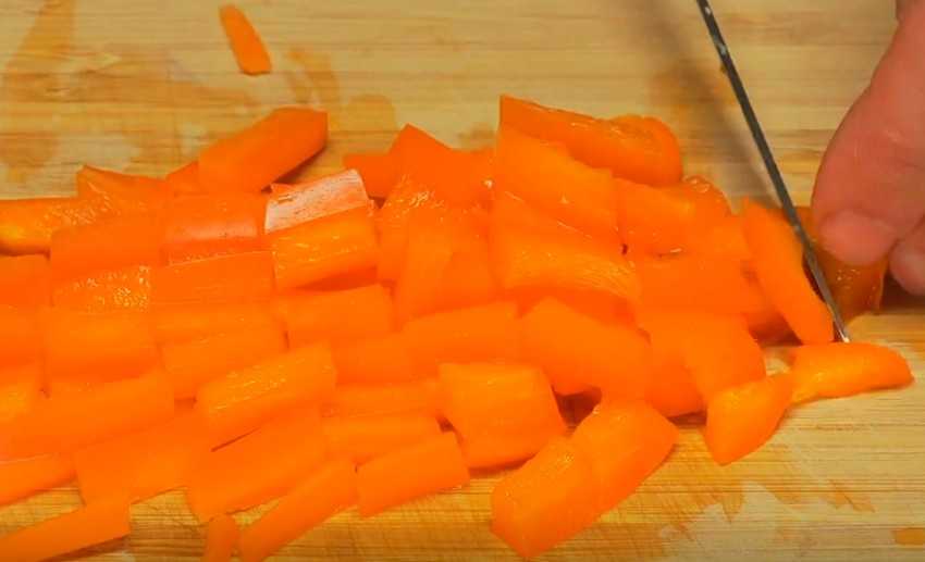 Перец очистить от перегородок и семян, мякоть нарезать кубиками.