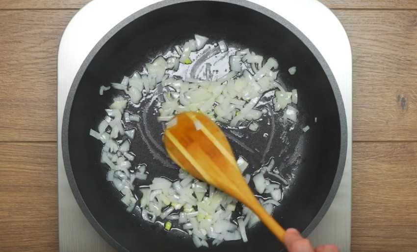 2. Разогрейте на сковороде растительное масло. Выложите лук и обжарьте, помешивая, в течение 1 минуты до прозрачности.
