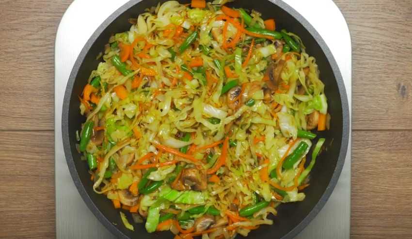 4. Капусту добавьте к остальным овощам и 3 минуты обжаривайте. Отправьте на сковороду перец с грибам, перемешайте и обжаривайте 5 минут. После накройте крышкой и потушите на среднем огне еще 6 минут.