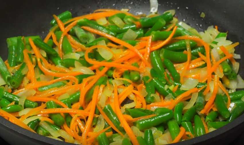 3. Добавьте морковь, перемешайте и обжаривайте еще 1 минуту. Выложите на сковороду зеленую фасоль, снова перемешайте, обжаривайте 3 минуты.